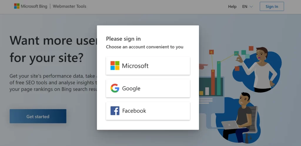 Head over to the Bing Webmaster Tools website and sign in with your Microsoft, Google or Facebook account.