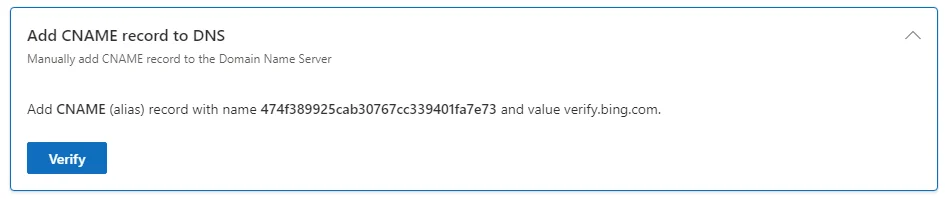 • Adding a new CNAME record with the details provided by Bing Webmaster Tools.