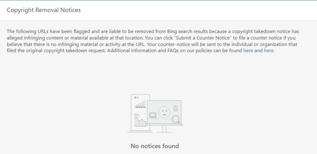 • See copyright removal notices: Bing Webmaster Tools can show you if there have been copyright infringement claims made against your website.