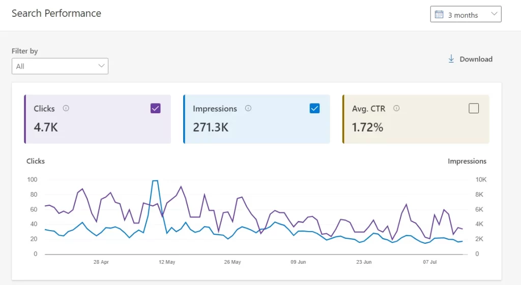 • Click-through Rate (CTR): The percentage of users who clicked on your website after seeing it in Bing search results (impressions divided by clicks)