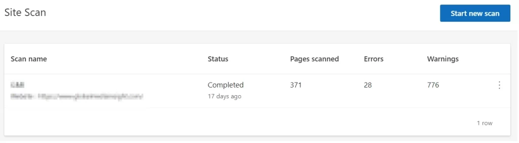 • Upon scan completion, you can review the scan’s progress, total pages analyzed, identified issues, and a detailed breakdown of errors and warnings categorized by severity and affected pages.