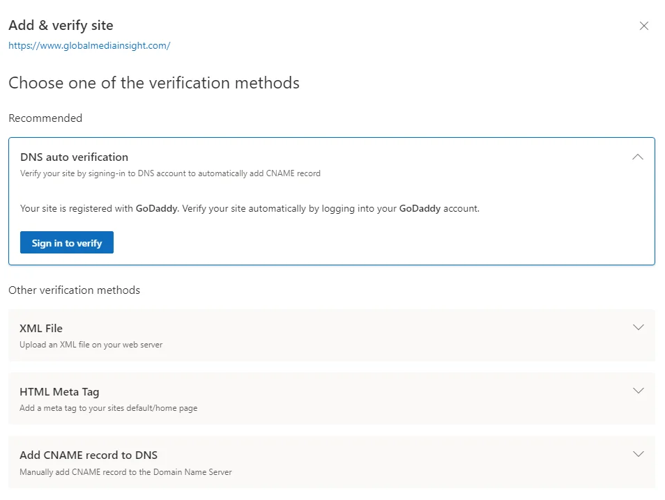 Bing offers multiple verification methods for confirming your ownership.