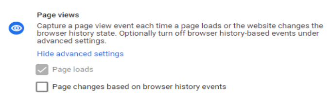 Page view tracking is automatically enabled via Enhanced Measurement – you can’t disable it. GA4 can also track History Change events (when the URL changes without the page reloading). These are very common in SPAs (Single Page Applications). However, you can decide if you need to track page views based on “browse history events”.