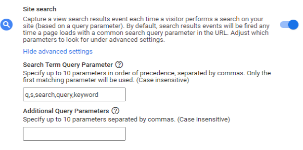 The Site Search functionality triggers an event each time a user performs a site search on the website, and the page loads with the URL containing a query parameter, such as q, s, search, query or keyword. But if you want, you can include more of them (up to 10 parameters).