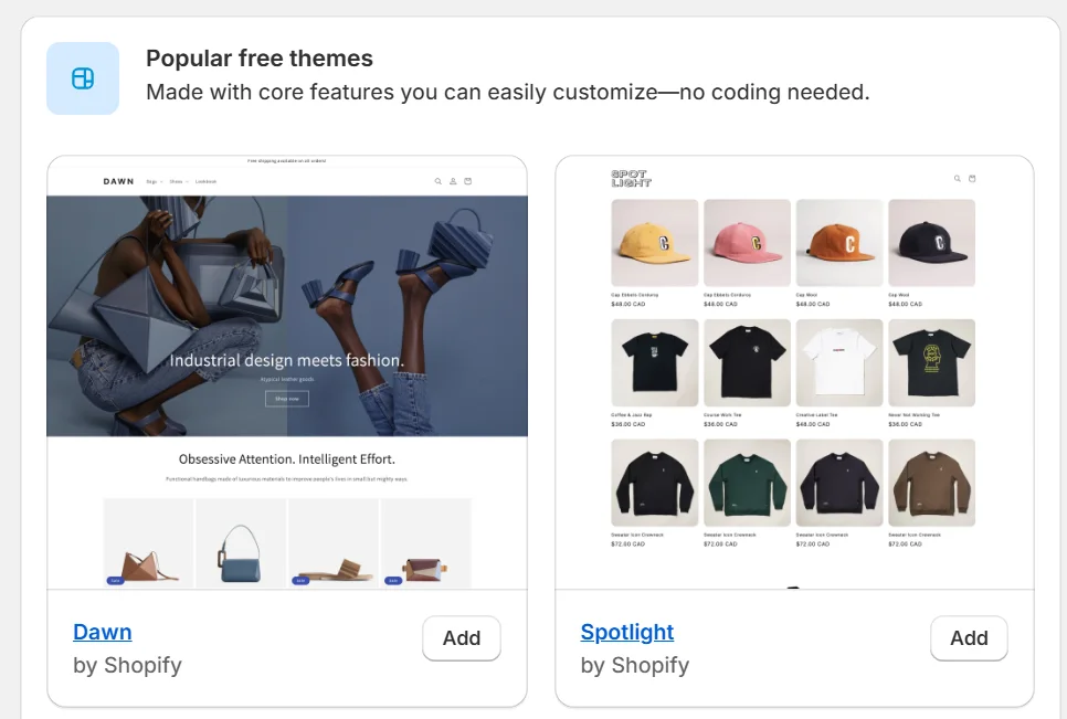 • Browse the Theme Store: Navigate to Online Store > Themes in your Shopify admin. Explore free themes directly or visit the Shopify Theme Store for additional options, including premium themes.