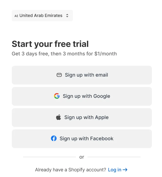 Sign up on Shopify, choose the UAE, and enter your details for setup. Select a plan after signing up.