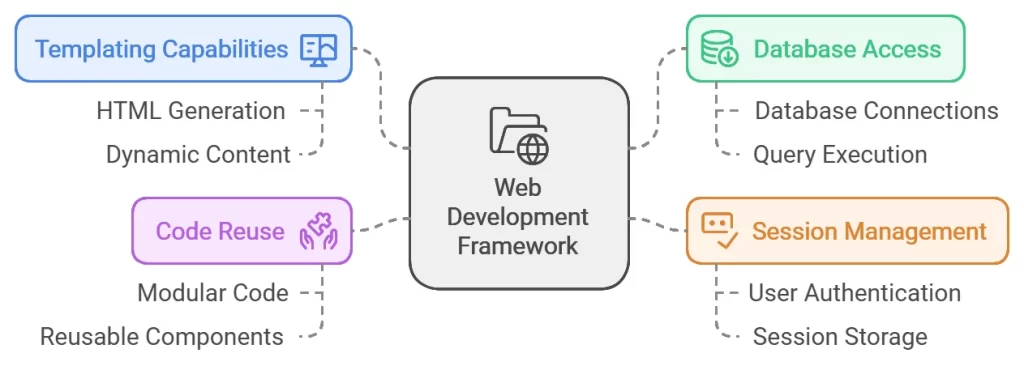 These frameworks come with templating capabilities, libraries for database access, session management, and code-reuse features that help speed development.